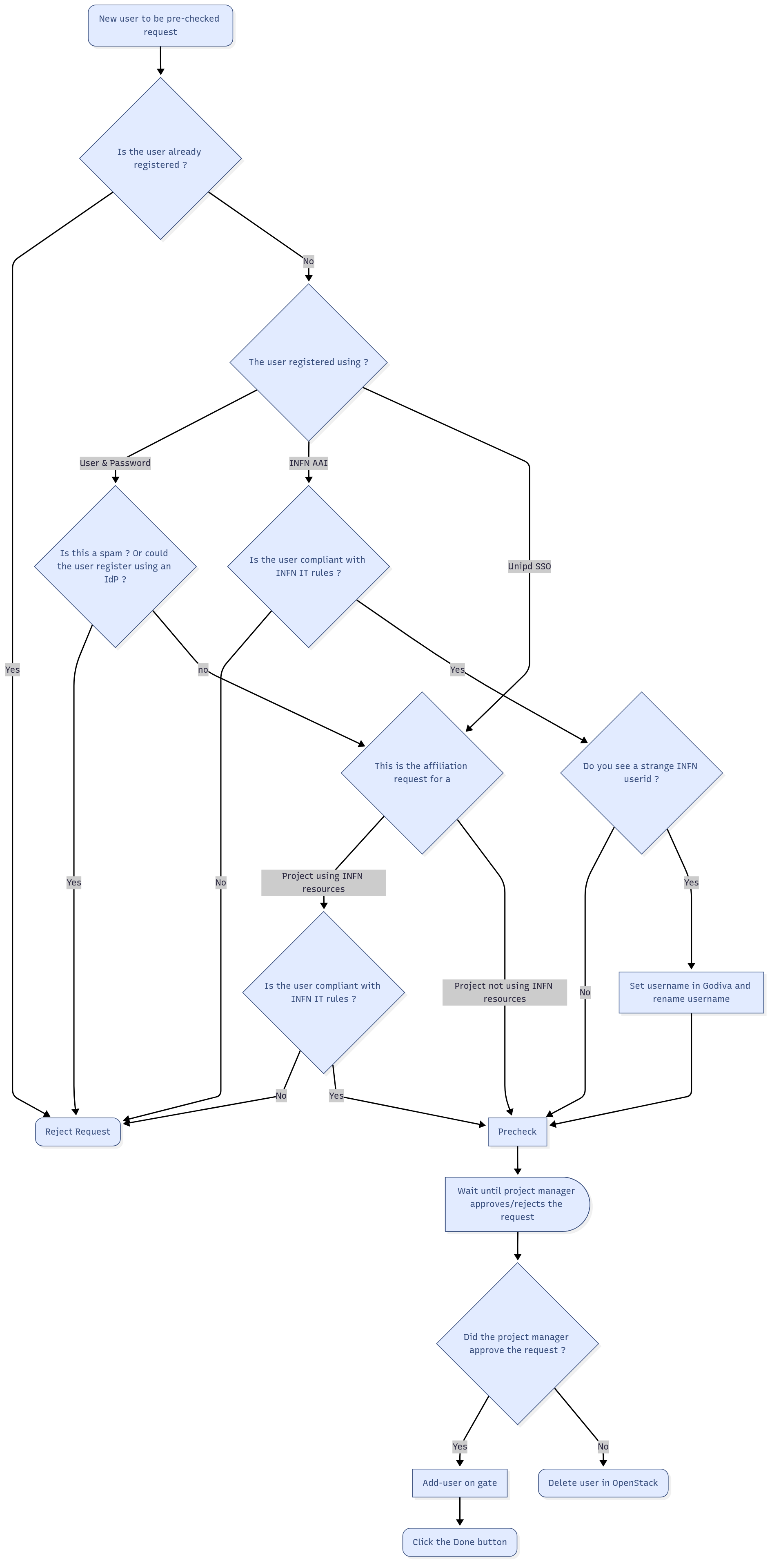 This howto explains how to manage the "New user to be pre-checked" i.e. requests for a user to register to the Cloud and asking for the affiliation to an existing project.