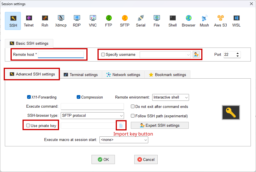 Select “SSH” from the list of available sessions and enter the IP address of the UI in the “Remote host” field. Flag the “Specify username” option and insert your username. Now click on the “Advanced SSH settings” tab and then on the “Use private key” checkbox. To import your key, click on the button to the right of the text field (labeled as “Import key button” in the following figure) and select your key from the file chooser window that just opened. Alternatively, you can paste the path of the private key in the text box (in our example should be “%UserProfile%.sshyour_key”). Eventually, you can press the “OK” button to save the settings.