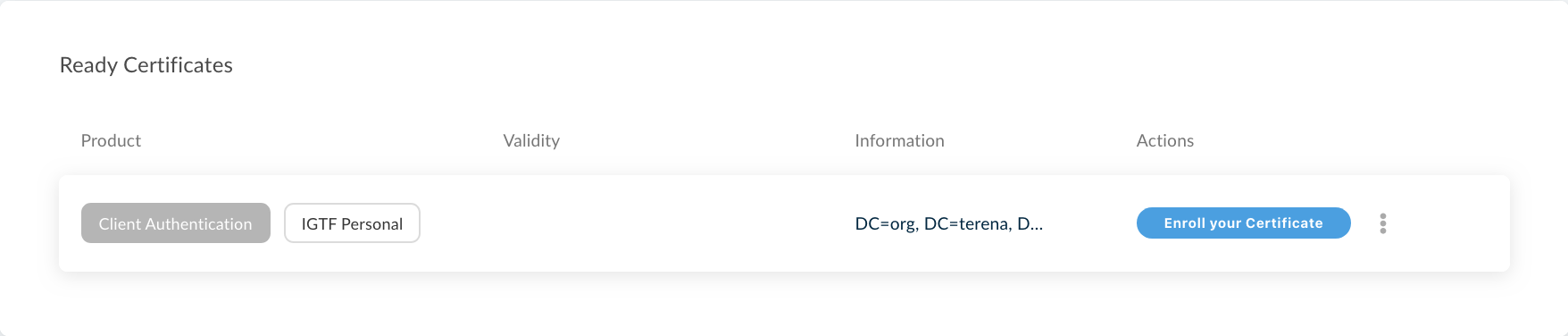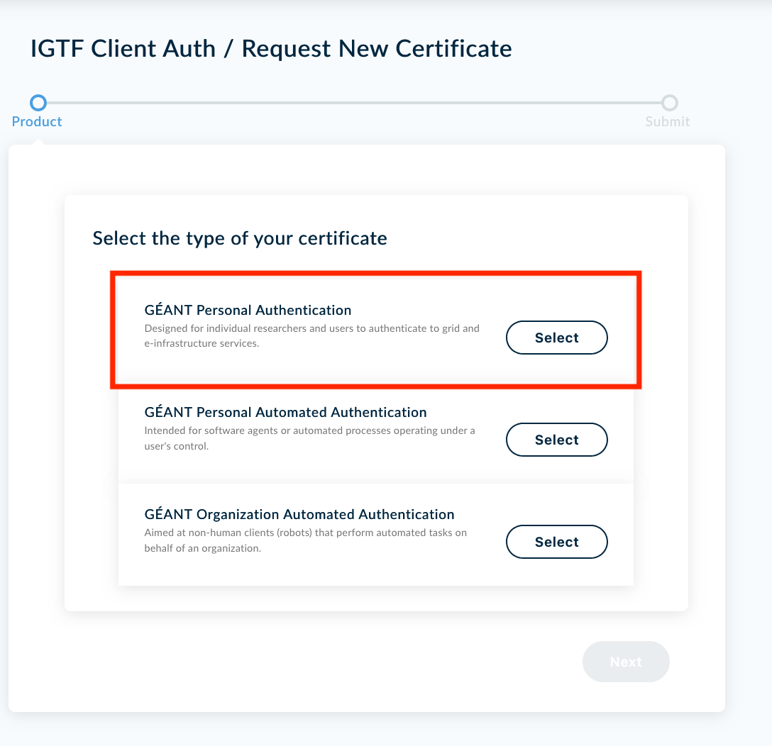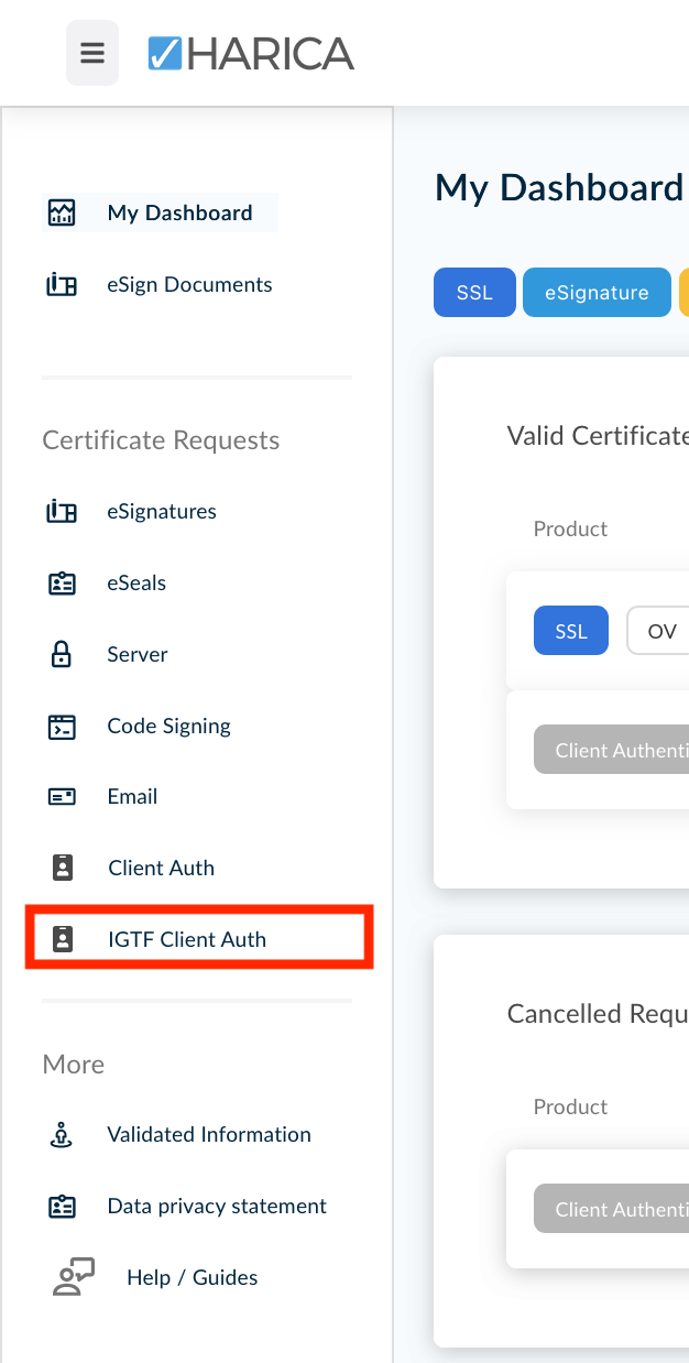 - After logging in successfully there should be a menu on the left-hand side with the option IGTF Client Auth