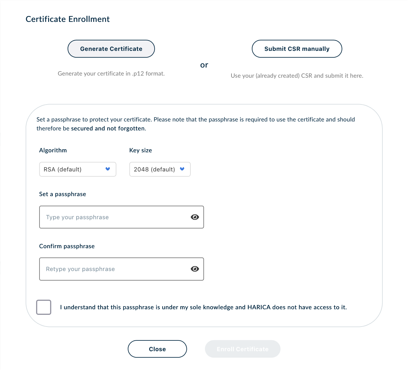- After clicking on Enroll your Certificate you'll be able to define the signing key of your certificate and a passphrase